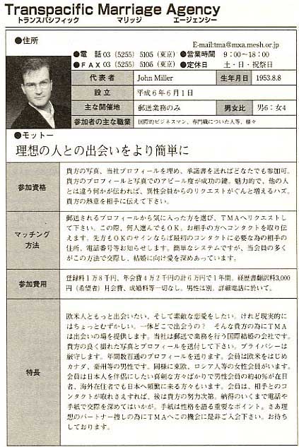 Work in Japan!For information about employment opportunities in Japan, click here! Teaching English in Japan and need students? click here! What TMA is not...TMA is not an online dating site where members log in and send each other messages. TMA is not a dating or escort service where contacts with women can be made on short notice. TMA is not a site where just any man can purchase the contact information of any woman who interests him. The woman must see the man's profile and authorize release of her contact information to him before he can receive it. Web Profile PostingNo man's profile will appear on the TMA website without permission from the man. TMA is a postal mail & email based matchmaking system. We distribute your profile discreetly by postal mail and by email (as a PDF file) so it's not necessary for your profile to appear on the TMA website. TMA News!If you'd like to be notified by email when new Japanese women's profiles are posted on the TMA site, subscribe to the TMA News! Success Story“I joined TMA as a Diamond member and met a man through your company last December. And finally, we got married this August!! I really want to tell TMA staff thank you. I'm very happy to be able to meet him and get together. Thank you!!” Saeko, Tokyo, Japan How to joinTo become a TMA client is simple. Just follow the simple steps summarized on the Registration Checklist. As soon as your payment is confirmed, TMA will make your profile and send you a letter explaining in greater detail how to use our system, as well as any Free Bonus Offers you requested. Then, we'll begin distributing your profile to our women clients, and you'll begin receiving a new set of women's profiles every month.