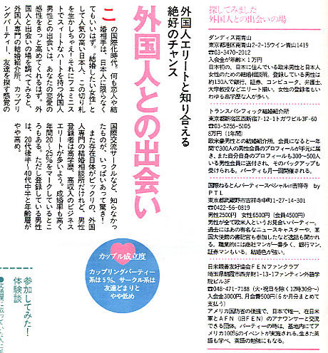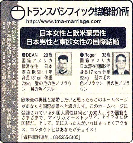 Media Coverage of TMA in JapanBelow are some examples of media coverage of TMA by major media in Japan. Awareness of TMA and its Western Men / Japanese women matchmaking services has been growing steadily since 1994. TMA is your best bet for finding the Japanese wife you've been dreaming of!